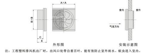 注:工程塑料排風機出廠時,出風口處帶自垂百葉,能在效防止室外雨水、蚊子進入室內。