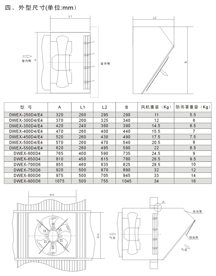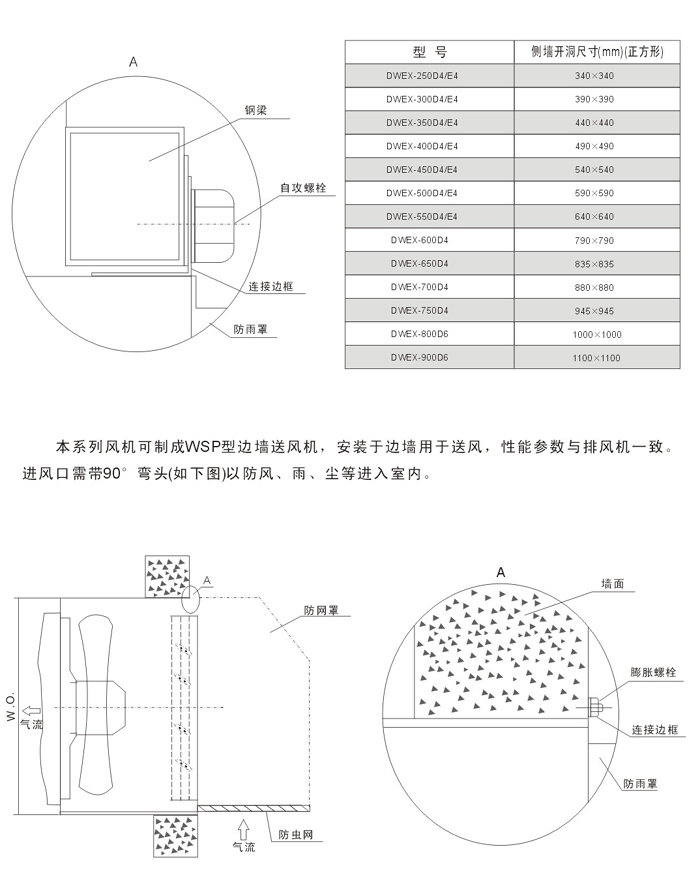 DWEX邊墻風(fēng)機(jī)又叫WEX邊墻風(fēng)機(jī),其采用的前掠型葉片、低噪音的外轉(zhuǎn)子或內(nèi)轉(zhuǎn)子風(fēng)機(jī)專用電機(jī)直聯(lián)傳動(dòng),方形外殼設(shè)計(jì)可以方便地安裝在混凝土墻、磚墻或輕鋼壓型墻板上,方形防雨罩結(jié)構(gòu)牢固,外形美觀。具有噪聲低、風(fēng)量大、運(yùn)行可靠、性能參數(shù)范圍廣、安裝簡(jiǎn)便等特點(diǎn)。根據(jù)輸送介質(zhì)的要求,可制成防腐、防爆型。 DWEX(WEX)系列風(fēng)機(jī)一般用于邊墻壁式排風(fēng),配設(shè)45°防雨罩(或特殊制造成60°)和防蟲網(wǎng)(夜間可防止昆蟲循燈光飛入車間)??砂葱枰瞥蛇厜λ惋L(fēng)機(jī)型號(hào)為DWSP(WSP),配設(shè)90°防雨罩(防風(fēng)、雨、塵)和防蟲網(wǎng)(夜間可防止昆蟲循燈光飛入車間)。